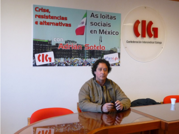 Na súa recente visita a Galiza, impartiu unha conferencia-coloquio de formación para cadros sindicais da CIG que tivo lugar o pasado venres 13 de febreiro en Compostela, e unha charla baixo o título “Crise, resistencias e alternativas. Unha perspectiva desde México”, se celebrou en Vigo o luns 18.