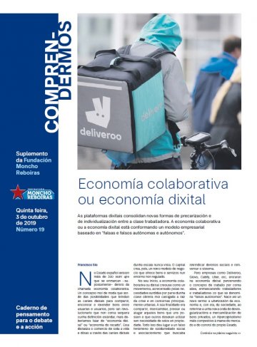 Nesta nova entrega do suplemento Comprendermos, dedicamos as primeiras páxinas a unha análise realizada por Francisco Sío, Sec. Confederal de Negociación Colectiva, sobre como as plataformas dixitais consolidan novas formas de precarización e de individualización entre a clase traballadora. A economía colaborativa ou a economía dixital está conormando un modelo empresarial baseado en “falsas e falsos autónomas e atónomos”.