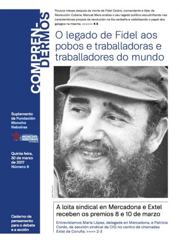 No número 9, en páxinas centrais, réndese unha modesta homenaxe á personalidade revolucionaria de Fidel Castro, falecido en novembro pasado, cun traballo de Manuel Mera no que analiza o legado político e teórico de Fidel aos pobos e á clase traballadora do mundo. Entrevistámonos con María López, delegada da CIG en Mercadona, galardoada este ano co premio 8 de marzo que lle entregou a central sindical en recoñecemento á súa resistencia fronte unha empresa manifestamente represora e hostil ao sindicalismo de clase e combativo. Publicamos tamén unha entrevista a Patricia Cordo, representante da sección sindical da CIG na empresa Extel da Coruña, receptora do premio 10 de marzo deste ano pola loita mantida contra esta filial da multinacional suiza Adecco. Doutra parte, Miguel Malvido, Secretario Confederal de Emprego e Industria da CIG analiza a situación laboral na Galiza, onde a temporalidade e o traballo a tempo parcial veñen precarizando até o extremo a contratación. Na sección conceptos, Iuri Domènech cuestiona desde un enfoque de clase a Renda Básica Universal, como unha falsa solución a un problema mal formulado. Finalmente, o historiador Bernardo Máiz escrebe sobre o significado histórico do 10 de marzo do 1972, como gonzo transformador da clase traballadora galega.