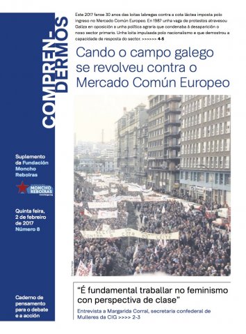 O número 8 de Comprendermos dedica as súas páxinas centrais a lembrar a histórica mobilización labrega e popular que en 1987 se revolveu contra as consecuencias catastróficas do ingreso no Mercado Común Europeo. Unha vaga de protestos atravesou Galiza en oposición á cota láctea e a unha política agraria que condenaba o noso sector primario a unha gradual desaparición. O artigo de Manuel Mera, e unha entrevista con Emilio López (Milucho), daquela Secretario Xeral do Sindicato Labrego Galego, achégannos á realidade dunha loita que foi impulsada polo nacionalismo galego e na que ficou demostrada a capacidade de respota do sector. Contamos tamén neste número cunha entrevista a Margarida Corral, Secretaria Confederal de Muller da CIG, que nos convoca a “feminizar a loita sindical e incorporar a perspectiva de clase á loita feminista”. Doutra parte, Xabier Pérez Igrexas realiza unha análise sintética das últimas cifras e magnitudes socioeconómicas do país, na que se verifica o saqueo contra a clase traballadora. Na sección conceptos, Iuri Domènech aborda a centralidade da clase obreira na construción teórica (e práctica) de Marx e do marxismo, ao fío de se cumprir este ano o 150 aniversario da publicación do primeiro volume de O Capital. Finalmente, recollemos as liñas principais da actual campaña da CIG, pola defensa das pensións e a recuperación dos nosos dereitos, expostas por Suso Seixo en recentes intervencións públicas.