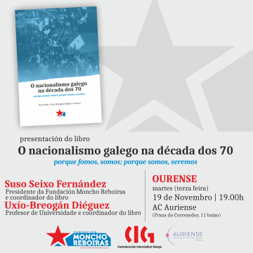 -Vigo, 29 de outubro, ás 19:30h. Salón de actos da CIG (R/Gregorio Espiño nº47), coa presenza de Suso Seixo, presidente da FMR e coautor do libro e Xulio Ríos, coautor do libro.