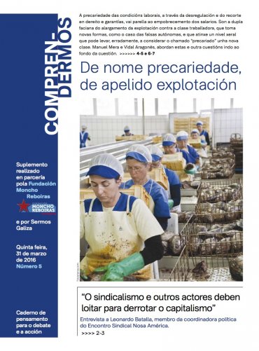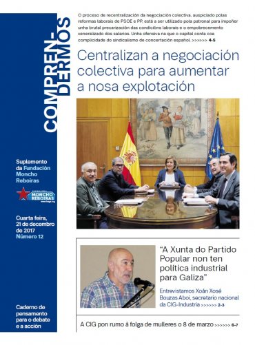 O último número de Comprendermos aborda nas súas páxinas centrais, a relación entre centralización da negociación colectiva e aumento da precariedade. Na súa análise, Francisco González Sío, secretario confederal de Negociación Colectiva da CIG, expón tamén a situación da negociación colectiva fronte ás novas realidades de subcontratación que multiplican as casuísticas de precarización da forza de traballo, tales como as falsas e falsos autónomos, as empresas multiservizos, os Centros Especiais de Emprego, as ETT e o traballo transnacional derivado da Directiva de Servizos da Unión Europea.
