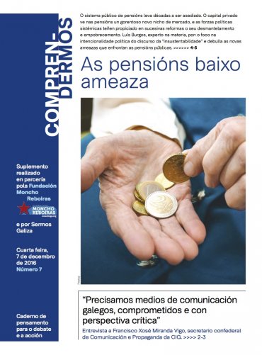 Neste novo número do Comprendermos pon o foco nas súas páxinas centrais, na cuestión das pensións, un debate aberto arredor da viabilidade e sustentabilidade do sistema público de pensións, Antolín Alcántara, integrante do Padroado da Fundación Moncho Reboiras,  achega algún datos e argumentos para comprender o verdadeiro alcance do problema político que encerra.