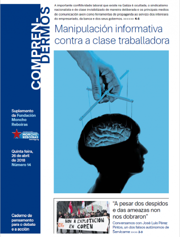 Na nova entrega do Comprendermos, analizamos nas capas principais do caderno a manipulación informativa contra a clase traballadora. Nestes epoca, destaca a ocultación informativa sobre os conflictos existentes no noso páis, o sindicalismo nacionalista e de clase invisibilizado de maneira deliberada e os principais medios de comunicación axen como ferramentas de propaganda ao servizo dos intereses do empresariado, da banca e dos seus gobertos.