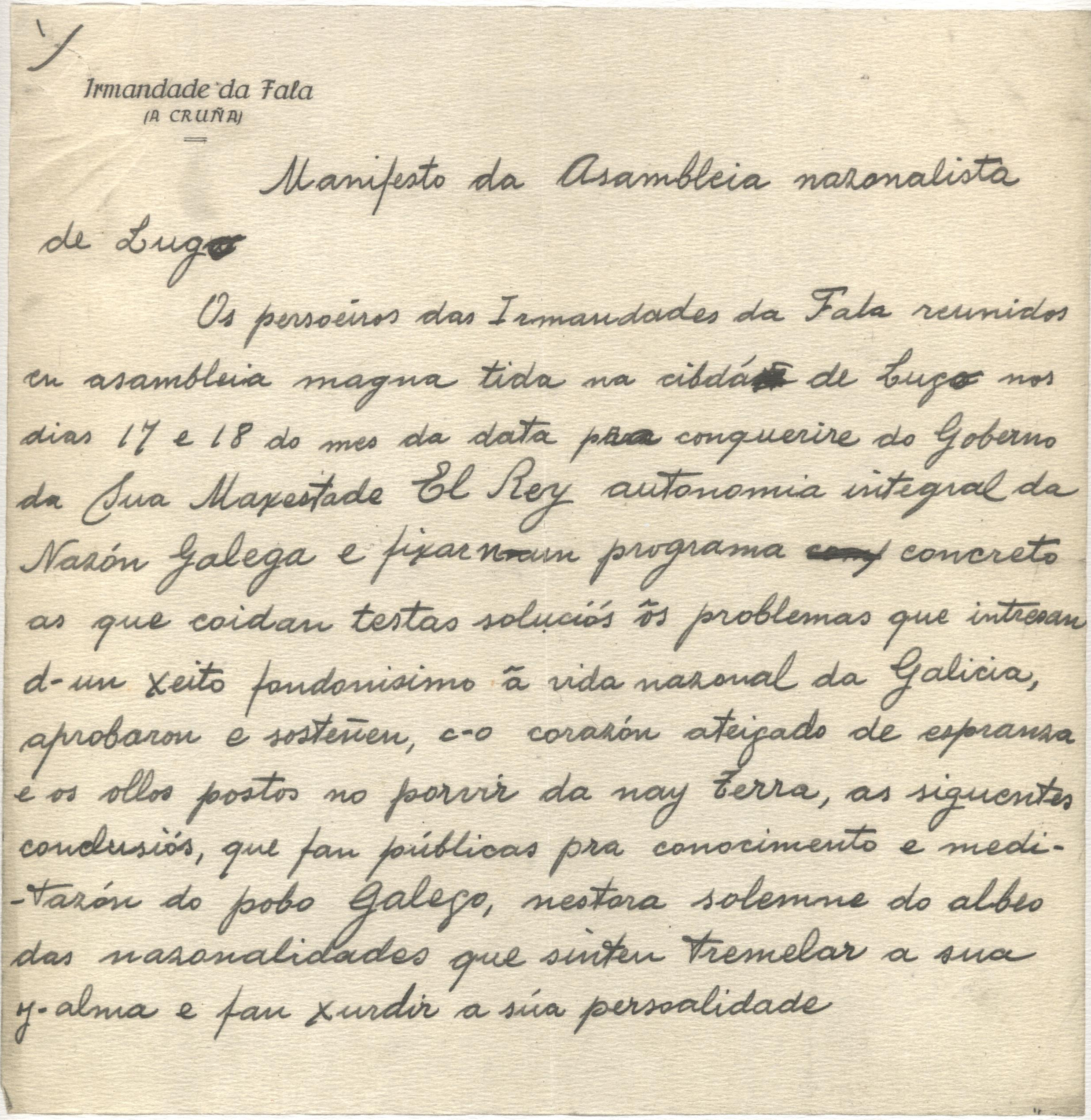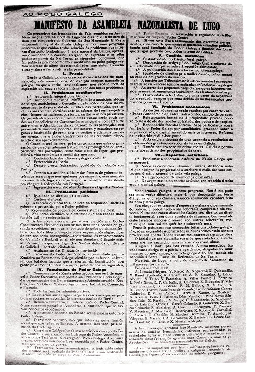 No mesmo documento, demandaríase a constitución dun ‘Poder Autónomo Galego’ e dun ‘Xuntoiro ou Parlamento galego’, así como dunha ‘Federación da Iberia’ -integrada polos Estados que se conformaran neste marco, incluído Galiza e Portugal-, e dun réxime tributario galego. Reclamaríase a igualdade de dereitos para as mulleres en relación aos homes, incluíndose a reivindicación do sufraxio universal (sen parangón na política da época). Reivindicábase a oficialización do idioma galego na administración e no ensino na Galiza (apostando pola cooficialidade co español), entre outras iniciativas de enorme alcance. Aliás, proclamaríase a ‘soberanía estética da Nazón Galega’, que se exercería sobre construcións urbanas e rurais, ditándose unha lei que obrigara ás e aos propietarios a ‘axeitarse o estilo das suas construciós ô estilo xeneral de cada vila galega’. Remataban as Irmandades da Fala o seu ‘manifesto’ de Lugo aseverando: